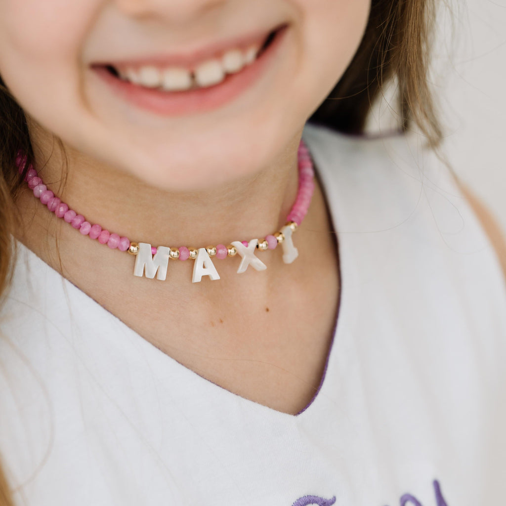Made with hand-dyed beads, 14K gold-filled beads, and mother-of-pearl letters.